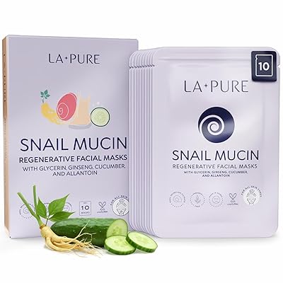 LA PURE Snail Mucin Mask 10ct Korean Sheet Mask Pack for Signs of Aging, Aid Skin Repair & Hydration Pure Snail Mask for Face with Collagen & Hyaluronic Acid Cruelty-Free Hydrating Sheet Mask